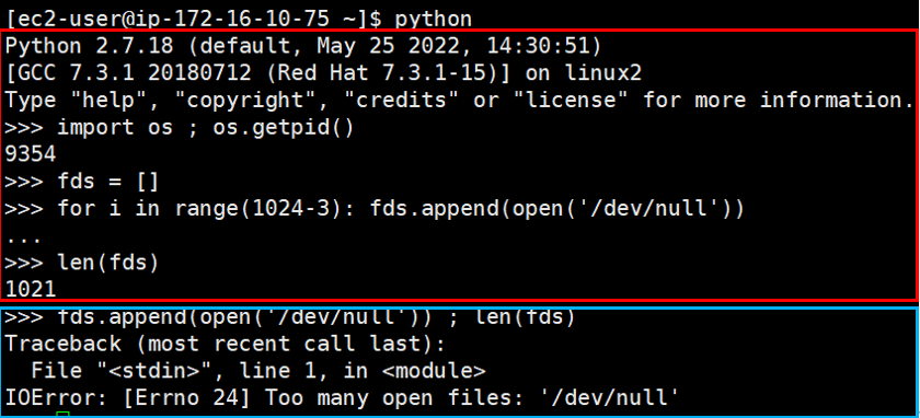 빨간 박스 : 1024개의 열린 파일 생성 / 파란 박스 : 1024개 이후 파일을 하나 더 열어본다