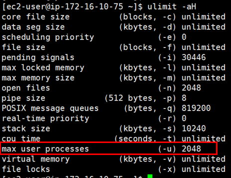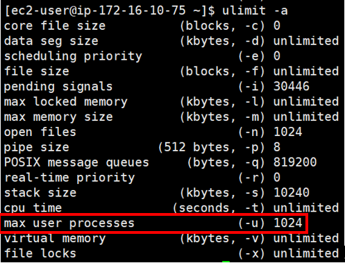 그림처럼 ulimit -a 명령의 max user processes 결과와 같이 ec2-user 계정은 1024개까지 스레드를 생성한 후, OOM 에러 메세지를 발생하며 멈춰버리게 됩니다. (이 경우 ec2-user 계정에서는 쉘 명령어 입력 등 어떤 작업도 동작하지 않습니다.)