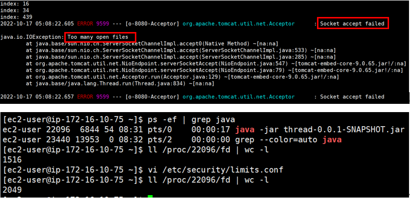 이제 에러가 발생했습니다. 파일은 딱 2048개 까지만 열린 것을 확인할 수 있는데요, openfiles의 값은 soft로 설정된 값이 아닌