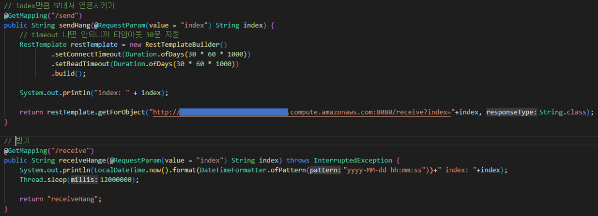 - RestTemplate로 소켓 생성 요청을 보내고, 요청을 받은 서버에서 20분간 응답을 대기 시킵니다.
