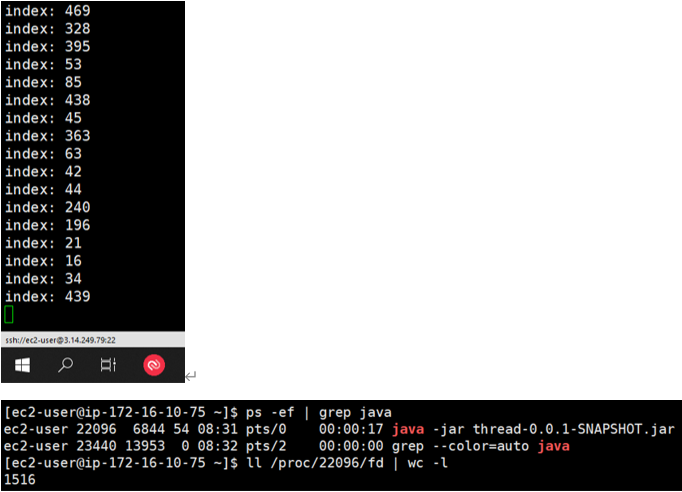 그림처럼 ulimit -a 명령의 max user processes 결과와 같이 ec2-user 계정은 1024개까지 스레드를 생성한 후, OOM 에러 메세지를 발생하며 멈춰버리게 됩니다. (이 경우 ec2-user 계정에서는 쉘 명령어 입력 등 어떤 작업도 동작하지 않습니다.)