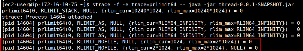 위 그림처럼 java 프로세스가 시작됨과 동시에 prlimit64라는 함수가 rlim_cur=1024값을 rlim_max=2*1024(hard limit) 값까지 업데이트하는 로그가 찍혀있는 것을 볼 수 있었습니다.
