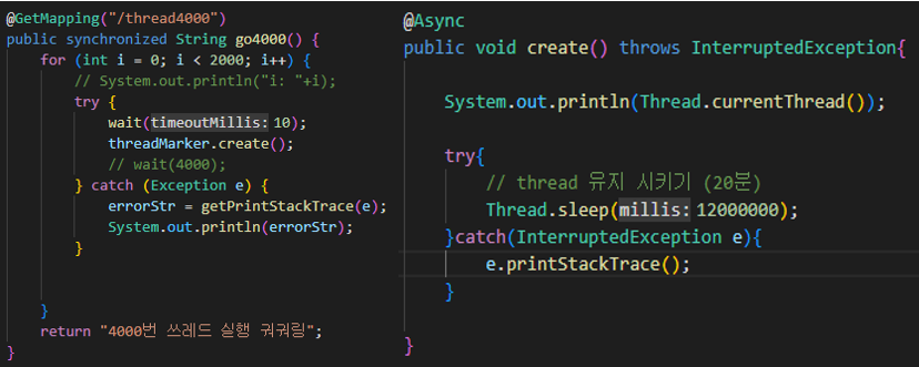 대략적인 코드의 내용은 HTTP 요청이 오면 비동기로 4천개의 Thread를 동시에 생성하고 20분간 유지하는 코드입니다.