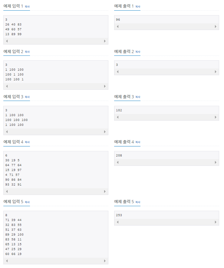 # dp ๋ฆฌ์คํธ์ n-1๋ฒ์งธ์ ์๋ ๋์ ๋ RGB ๋น์ฉ ์ค ๊ฐ์ฅ ์ต์ ๊ฐ์ ์ถ๋ ฅํ๋ค.