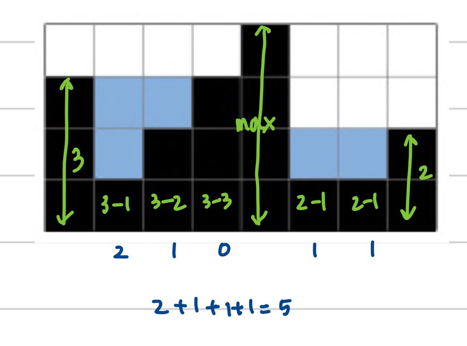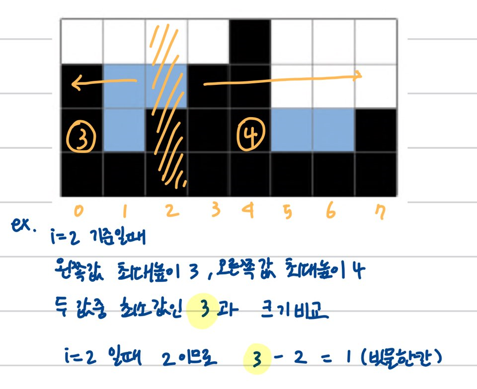 - ๋ฐ๋ณต๋ฌธ์ ๋๋ฉด์ ํ์ฌ์ ๋ธ๋ญ ๊ธฐ์ค left_max์ right_max๋ฅผ ๊ตฌํ๊ณ ์ด ๋ ๊ฐ์ค ์์ ์๋ฅผ ๊ตฌํจ